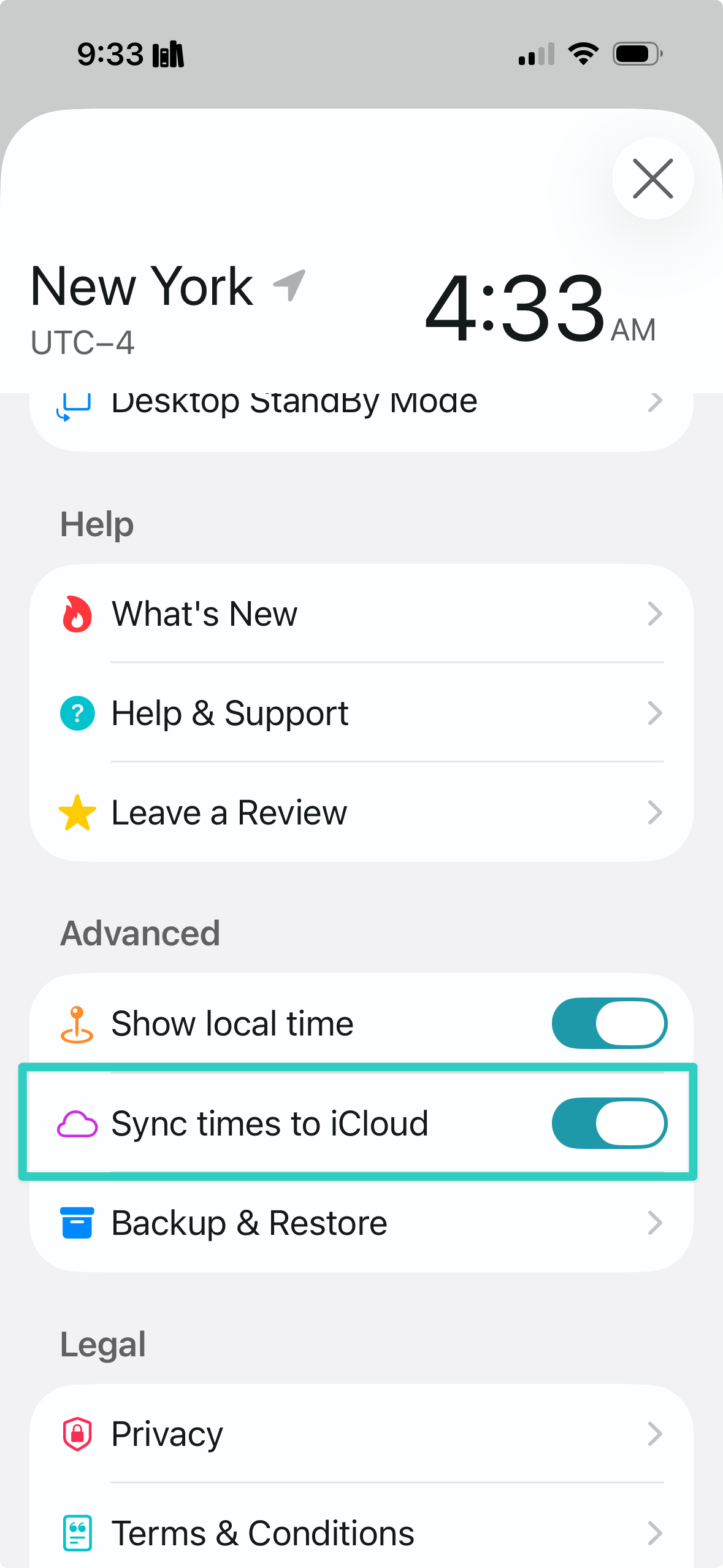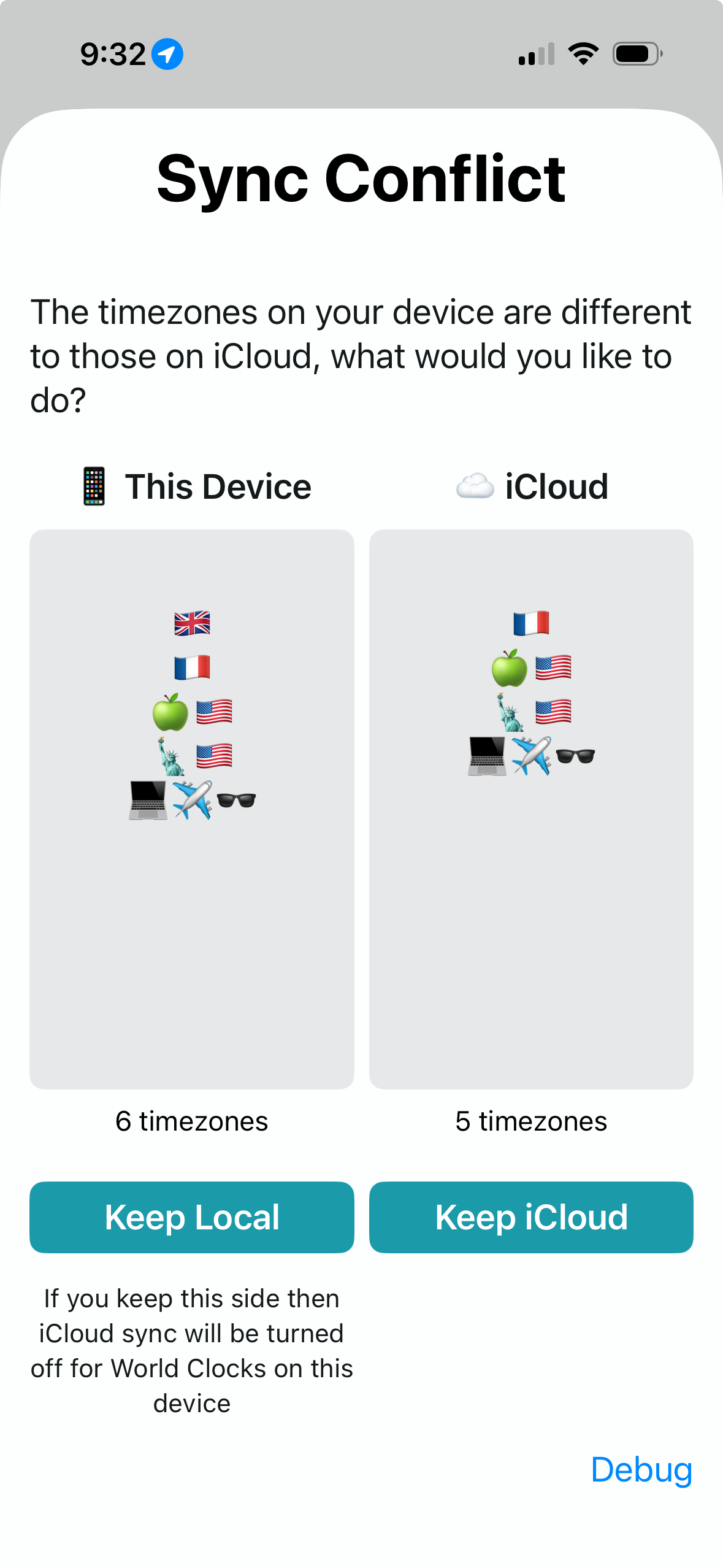 If you have World Time Widget on multiple devices and your settings are not the same, you may see a message letting you know there is a sync conflict.